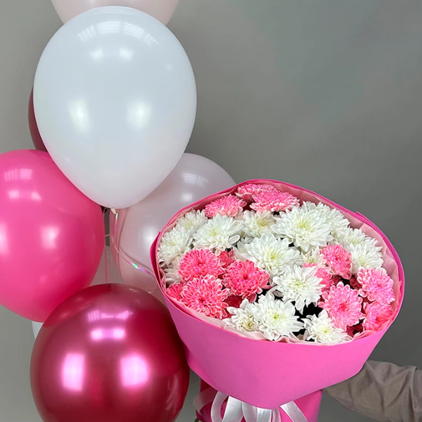 Ürün Kodu: FKB119Krizantem Pembe Beyaz & 7 Adet Helyum balon